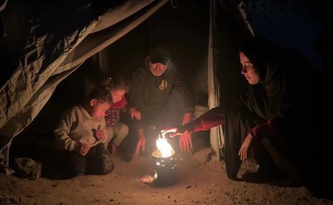 عائلة تشعل النار أمام خيمتها لتدفئة أطفالها في غزة