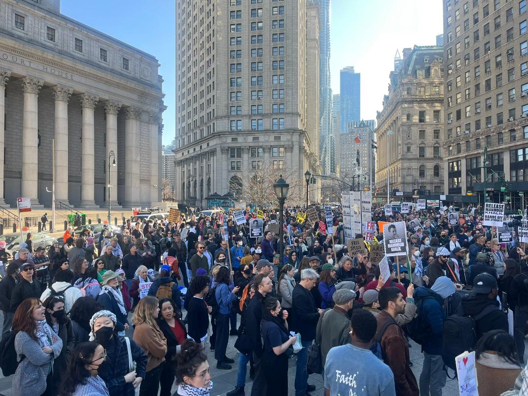 نيويورك 11-3-2025 وفا- شارك آلاف النشطاء في مظاهرة حاشدة في نيويورك، للاحتجاج على اعتقال الطالب الفلسطيني في جامعة كولومبيا، محمود خليل، الذي اعتقله ضباط الهجرة ضمن مساعيهم إلى ترحيله بتهمة المشاركة في أنشطة "معادية للسامية" حسب وصفهم، إبان "الإبادة الجماعية" التي ارتكبتها دولة الاحتلال ضد شعبنا في قطاع غزة.