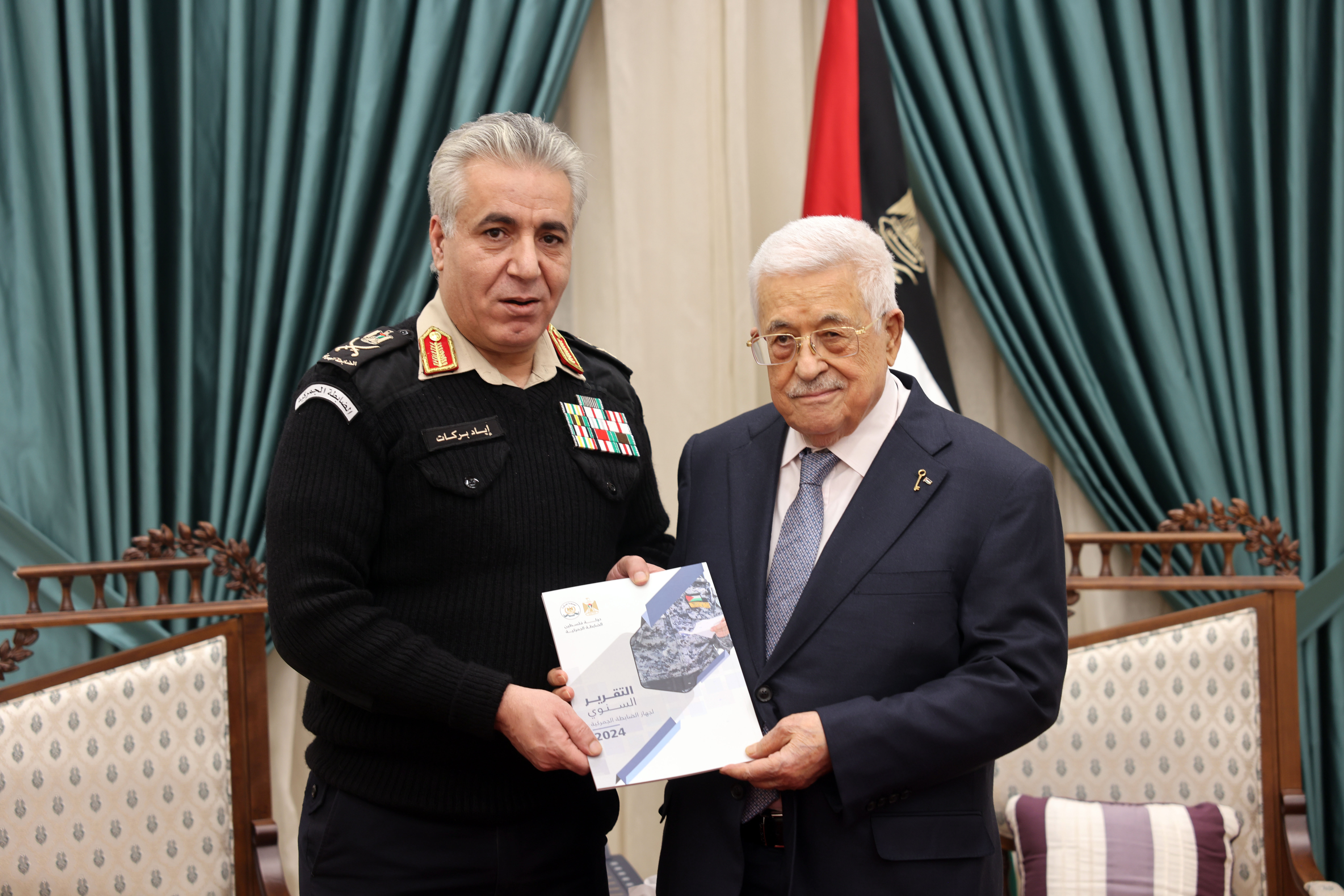 رام الله 17-3-2025 وفا- تسلم رئيس دولة فلسطين محمود عباس، التقرير السنوي لجهاز الضابطة الجمركية، وذلك خلال استقباله اليوم الاثنين، بمقر الرئاسة في مدينة رام الله، قائد جهاز الضابطة الجمركية اللواء إياد بركات.