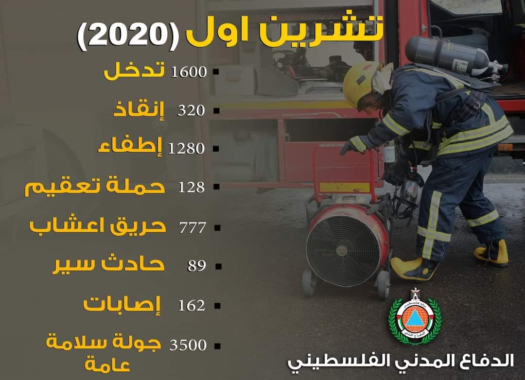 رام الله 4-11-2020 وفا- قال جهاز الدفاع المدني، إن طواقمه نفذت 1600 تدخل ما بين حرائق وحوادث وجولات الوقاية والسلامة العامة خلال شهر تشرين الاول المنصرم.