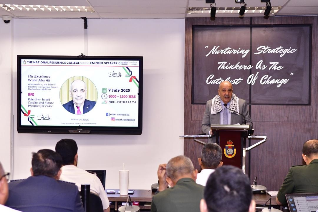 كوالامبور 10-7-2025 وفا- ألقى سفير دولة فلسطين لدى ماليزيا وليد أبو علي محاضرة بعنوان "الصراع الفلسطيني الإسرائيلي- الآفاق المستقبلية للسلام" تلبية لدعوة من الكلية الوطنية للصمود التابعة للقوات المسلحة الماليزية، بحضور إدارة الكلية وأعضاء الهيئة التدريسية ومجموعة من الضباط الماليزيين وعدد من الطلبة الدوليين من قطر، وبنغلاديش، والأردن، وتايلاند، وبروناي، وإندونيسيا.
