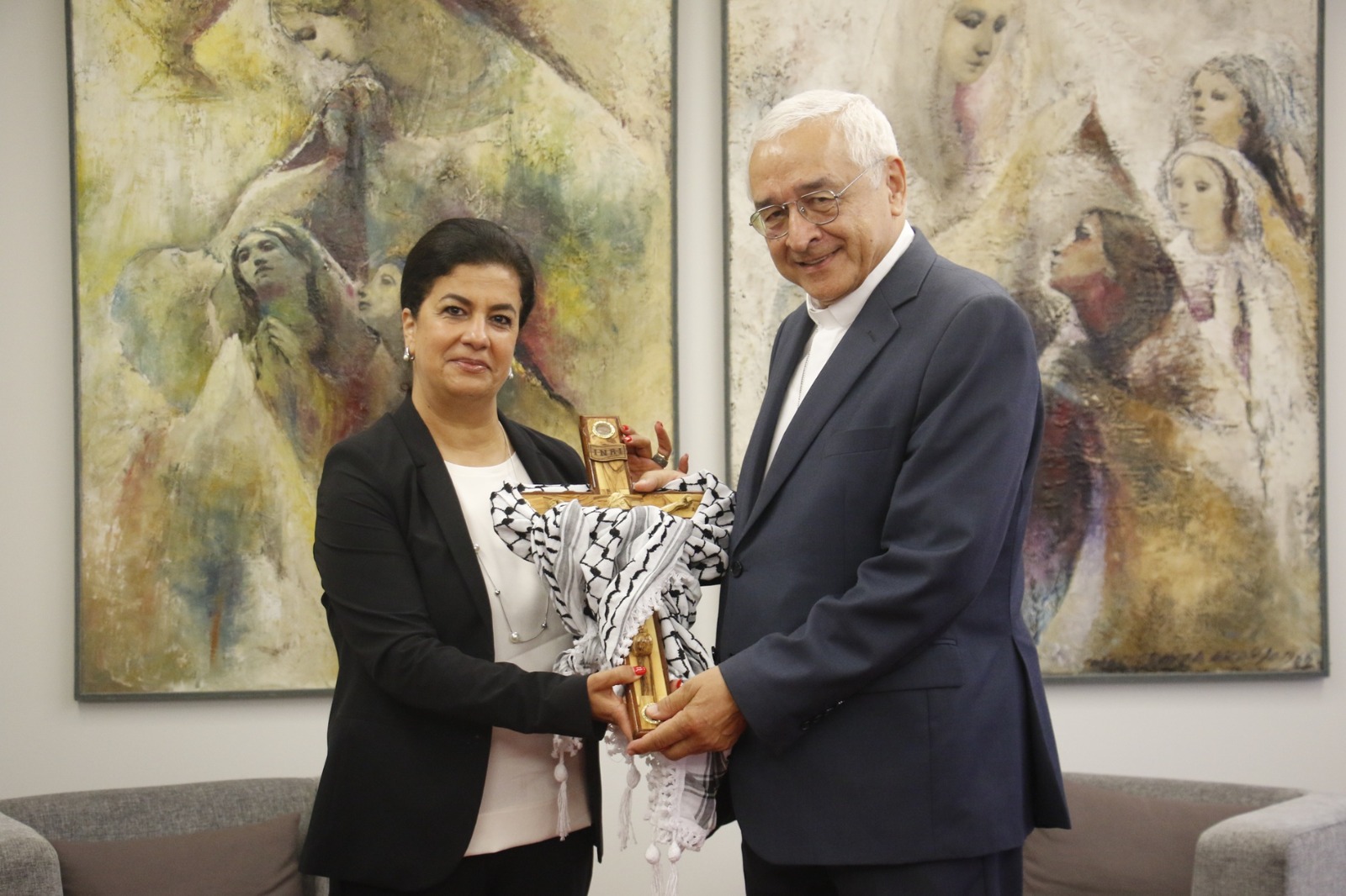 وبحثت السفيرة سليمان مع الأسقف، إمكانية إقامة فعاليات مشتركة تدعو للسلام في فلسطين.