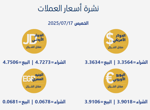 رام الله 17-7-2025 وفا- جاءت أسعار صرف العملات مقابل الشيقل الإسرائيلي، اليوم الخميس، بحسب سلطة النقد الفلسطينية، على النحو التالي: