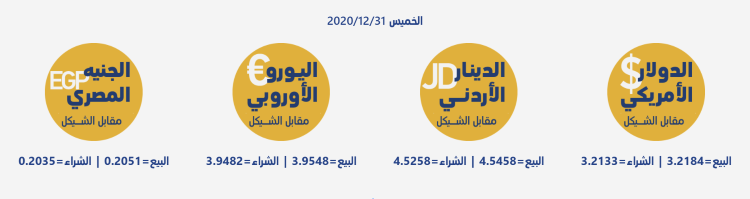 رام الله 31-12-2020 وفا- جاءت أسعار العملات مقابل الشيقل الإسرائيلي، اليوم الخميس، حسب سلطة النقد، على النحو التالي: