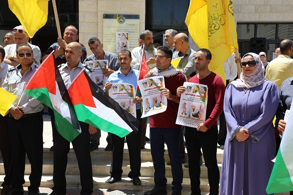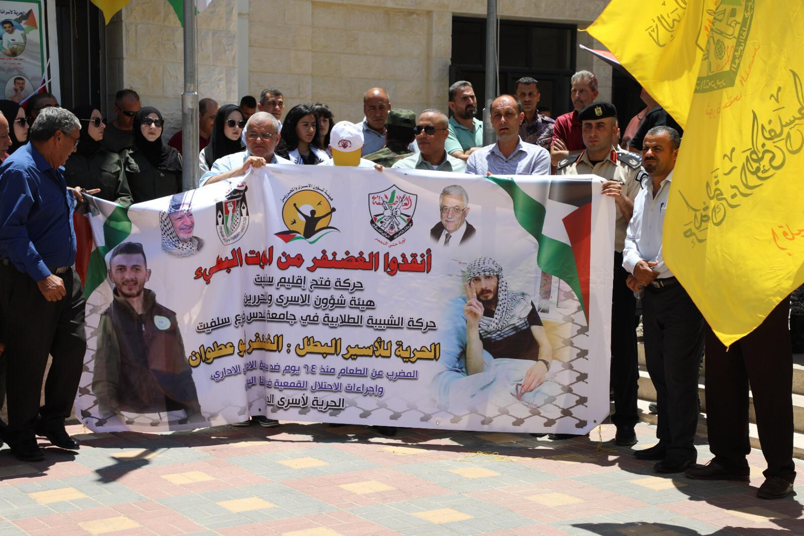 سلفيت 7-7-2021 وفا – نظمت حركة "فتح" إقليم سلفيت وهيئة شؤون الأسرى والمحررين ومؤسسات المحافظة وحركة الشبيبة الطلابية في جامعة القدس المفتوحة فرع سلفيت، اليوم الأربعاء، وقفة دعم وإسناد للأسير الغضنفر أبو عطوان، المضرب عن الطعام منذ 64 يوما في سجون الاحتلال الإسرائيلي، رفضا لاعتقاله الإداري.