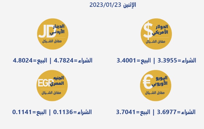 رام الله 23-1-2023 وفا- جاءت أسعار العملات مقابل الشيقل الإسرائيلي، اليوم الاثنين، حسب سلطة النقد، على النحو التالي:
