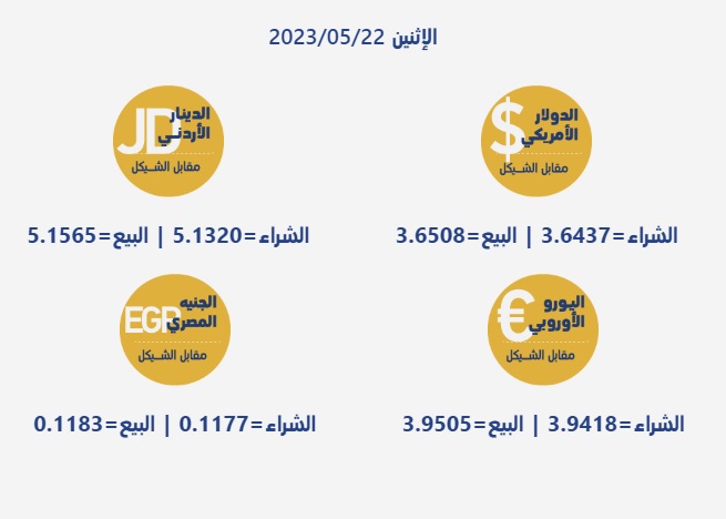 رام الله 22-5-2023 وفا- جاءت أسعار العملات مقابل الشيقل الإسرائيلي، اليوم الإثنين، حسب سلطة النقد، على النحو التالي: