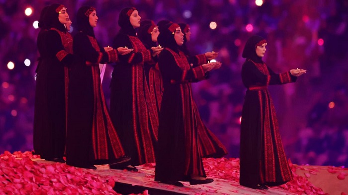 وشهد حفل الافتتاح ترديد أغنيات فلسطينية ومنها "ترويدة شمالي"، إلى جانب عرض بالزي التراثي الفلسطيني "الثوب".