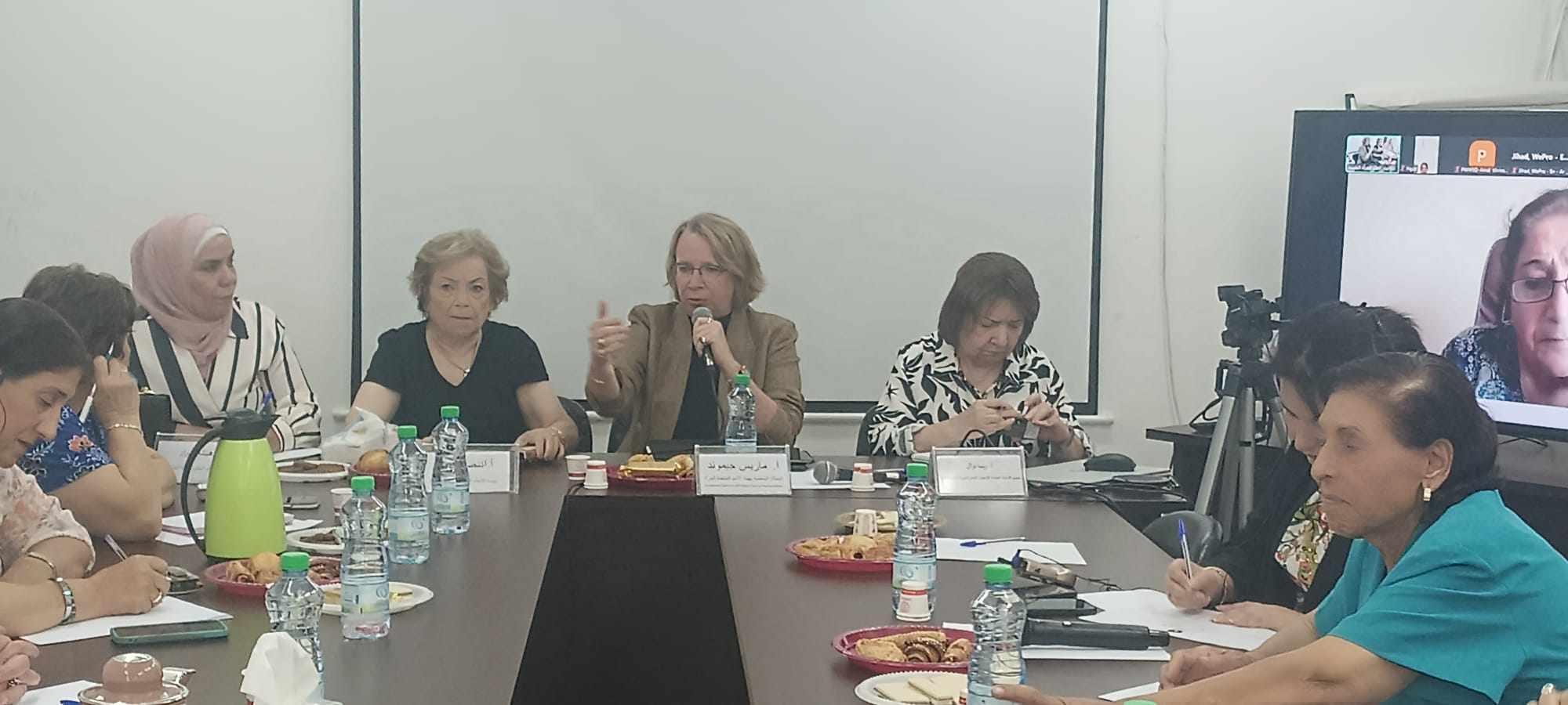 رام الله 2-7-2024 وفا- بحضور رئيسة الاتحاد العام للمرأة الفلسطينية انتصار الوزير، وعضوات الأمانة العامة والمؤسسات النسوية في الضفة الغربية وقطاع غزة، عقد اليوم اجتماع مع ممثلة مكتب الأمم المتحدة للمرأة السيدة ماريس جيموند، وذلك على أثر زيارتها لقطاع غزة.