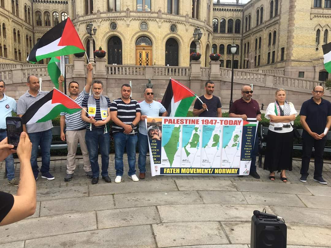اوسلو 28-6-2020 وفا- نظمت حركة فتح بالتعاون مع سفارة دولة فلسطين في النرويج وقفة تضامنية أمام البرلمان النرويجي في العاصمة اوسلو، دعما واسنادا لشعبنا وقيادته في مواجهة مخطط الضم الإسرائيلي الذي يستهدف تصفية القضية الفلسطينية.