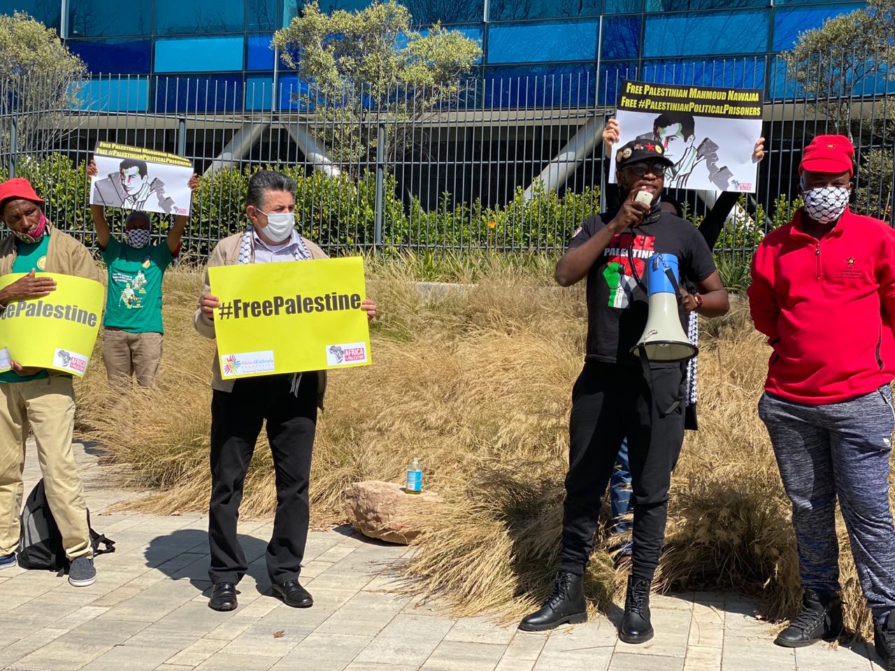 جوهانسبرغ 15-8-2020 وفا- نظمت مؤسسة افريقيا من اجل فلسطين، اليوم السبت، اعتصاما تضامنيا مع الاسير في سجون الاحتلال الناشط محمود النواجعة، امام القنصلية الإسرائيلية بمدينة جوهانسبرغ.