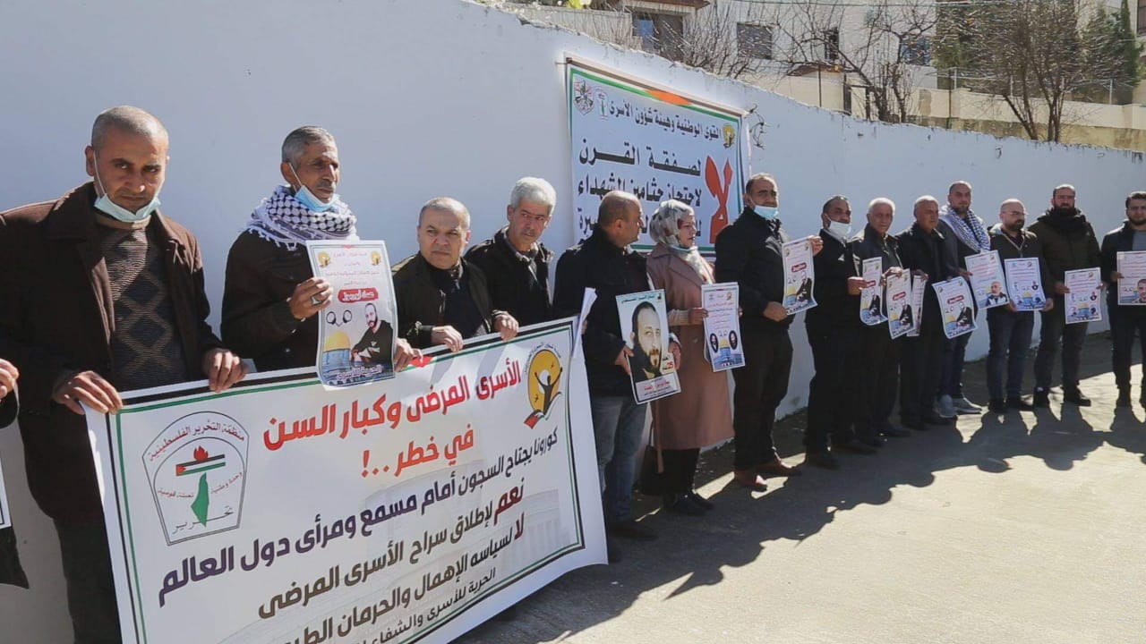 الخليل 1-2-2021 وفا- شارك أهالي الأسرى ومواطنون في وقفة إسناد للأسرى المرضى وكبار السن الذين يمرون في ظروف صحية صعبة مع تفشي فيروس "كورونا"، والتي حملوا خلالها شعار "لا لسياسة الإهمال والحرمان الطبي ونعم لإطلاق سراح كافة الاسرى المرضى وكبار السن"، وذلك أمام مقر الصليب الأحمر في مدينة الخليل، اليوم الاثنين.