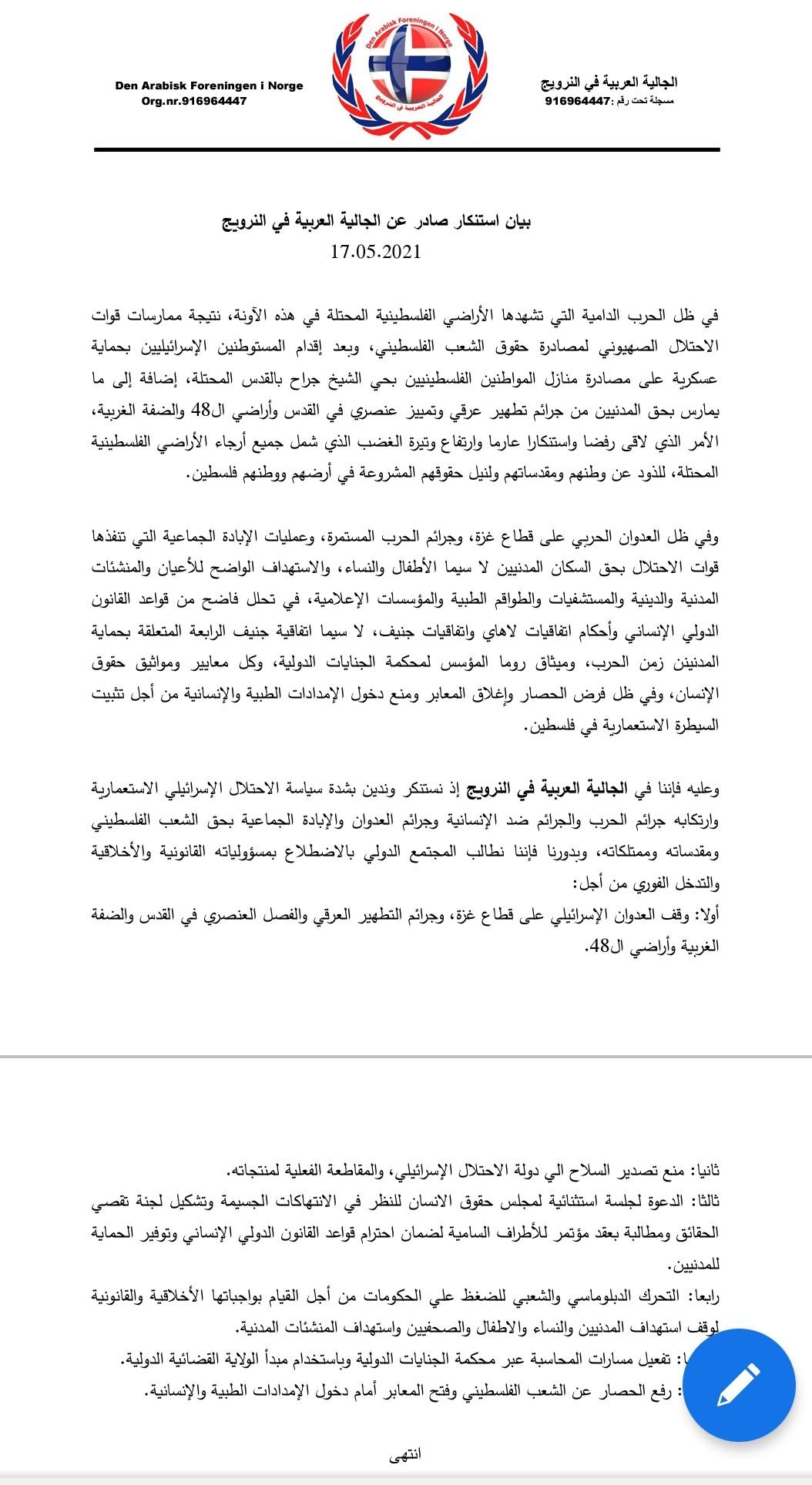 أوسلو 17-5-2021 وفا- استنكرت الجالية العربية في النرويج حرب الإبادة التي تنفذها قوات الاحتلال الإسرائيلي بحق الشعب الفلسطيني، وطالبت المجتمع الدولي وقف هذه المجازر فورا.
