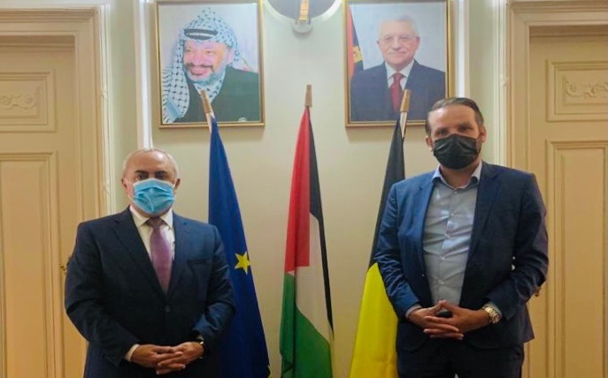 بروكسل 3-6-2021 وفا- وضع سفير دولة فلسطين لدى الاتحاد الأوروبي وبلجيكا ولوكسمبورغ، عبد الرحيم الفرا، عضو لجنة العلاقات الخارجية في البرلمان الفيدرالي البلجيكي النائب مالك بن عاشور، في صورة الوضع الحالي في فلسطين.