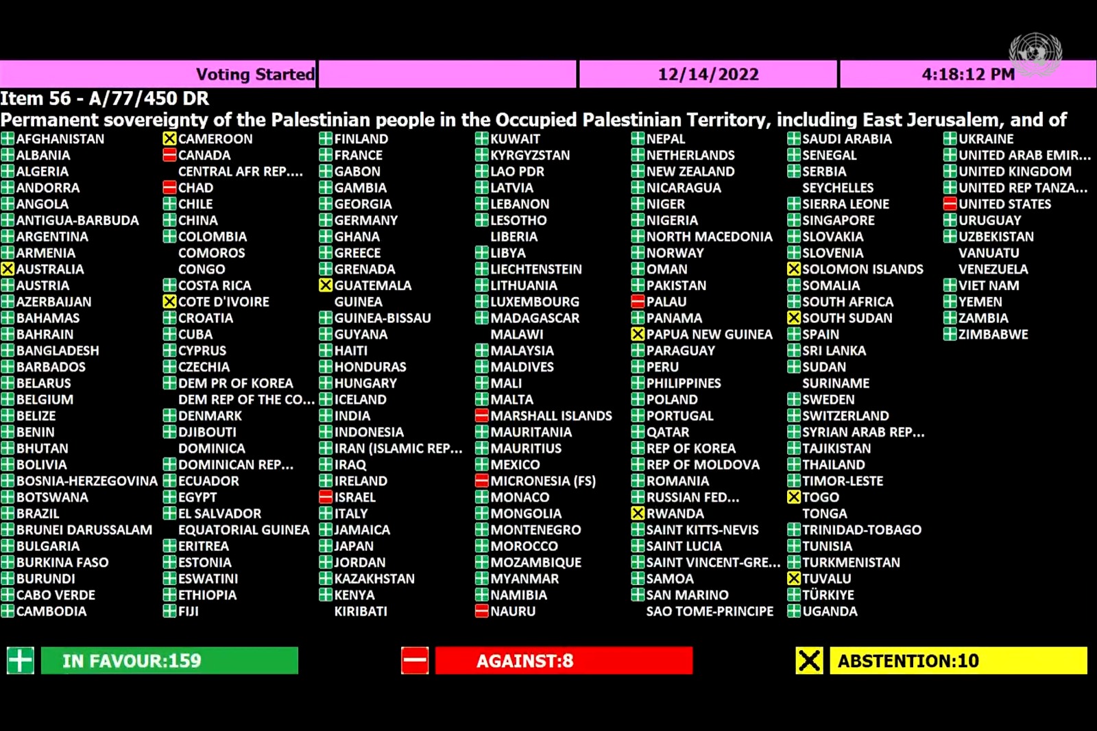 وصوتت لصالح القرار 159 دولة، وامتنعت عن التصويت 10 دول، في حين عارضته 8 دول هي (دولة الاحتلال الإسرائيلي، الولايات المتحدة الأميركية، كندا، تشاد، جزر مارشال، ميكرونيزيا، بالو، وناورو).