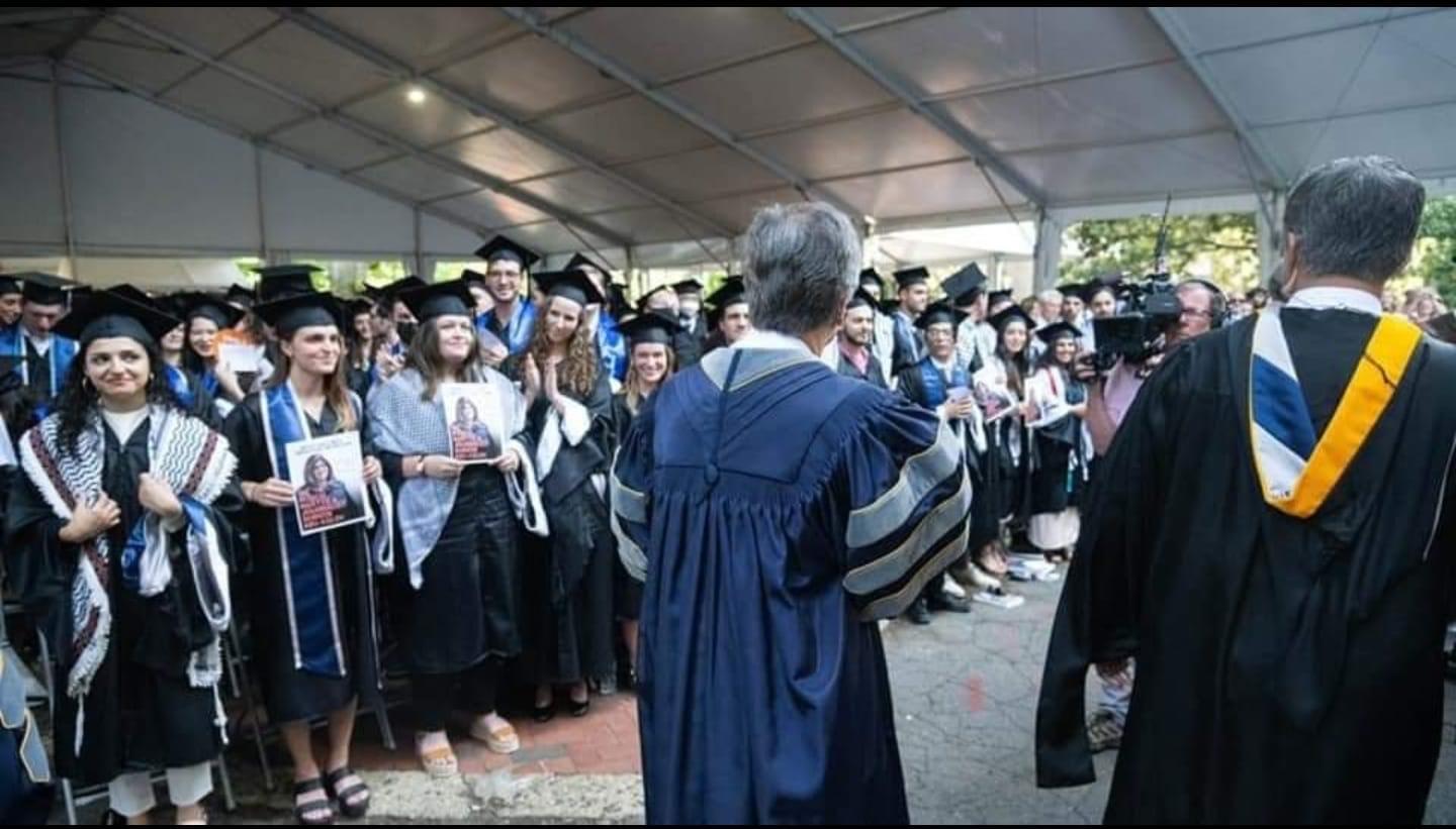 واشنطن 23-5-2022 وفا- رفع طلاب من ابناء الجالية الفلسطينية في جامعة جورج تاون صور الشهيدة شيرين ابو عاقلة واعلام فلسطين وارتدى بعضهم الكوفيات الفلسطينية خلال حفل تخرجهم الذي أشرف عليه وزير الخارجية الاميركي انتوني بلينكن.