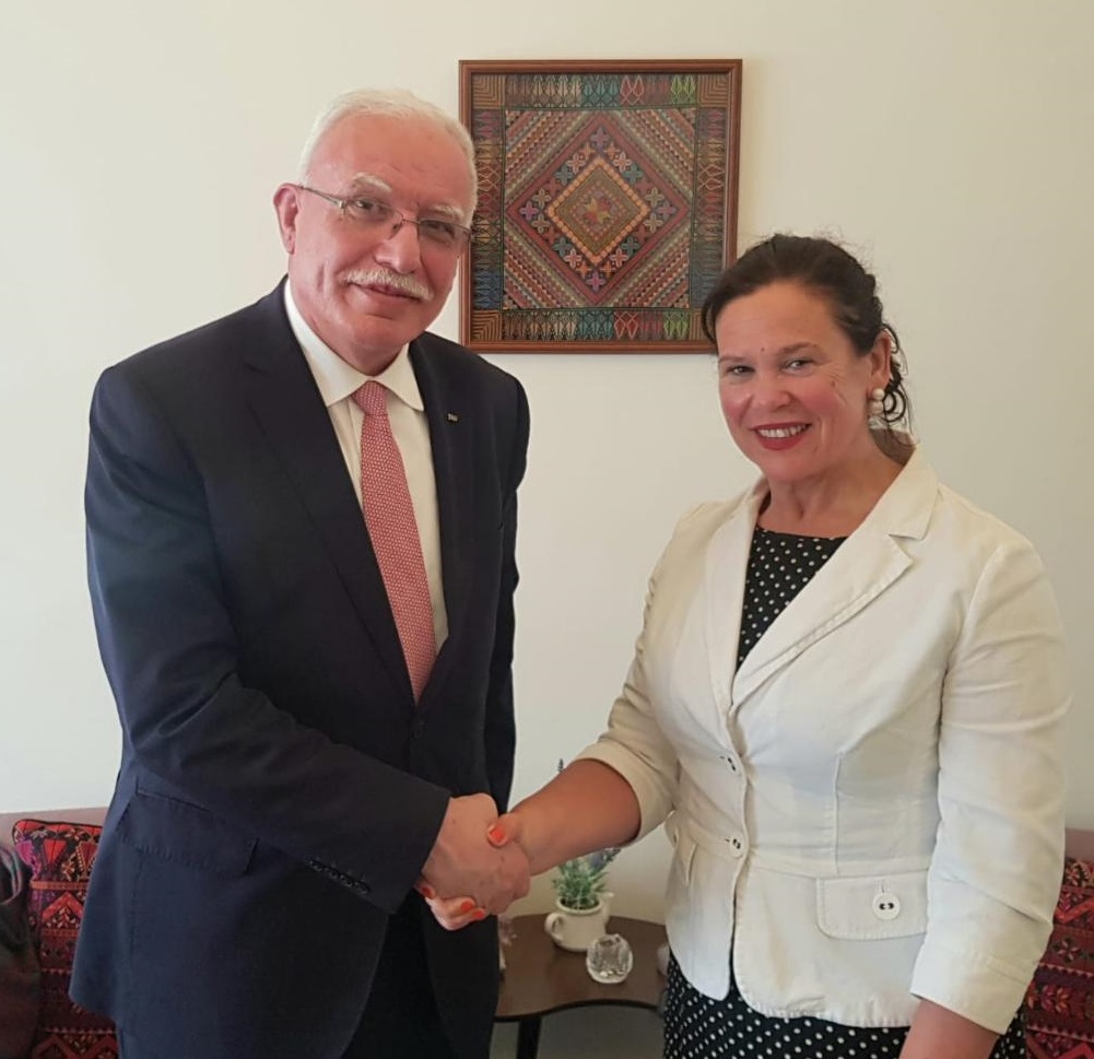 دبلن 8-5-2022 وفا- أطلع وزير الخارجية والمغتربين لدولة فلسطين رياض المالكي، اليوم الأحد، زعيمة حزب الشين فين، أكبر الأحزاب الإيرلندية المعارضة، ماري لو، على تطورات الأوضاع في فلسطين المحتلة، والجرائم التي ترتكبها إسرائيل، سلطة الاحتلال غير الشرعي، لترسيخ منظومة الأبارتهايد والاستعمار، من خلال الاستيطان والاستيلاء على الأراضي، والترحيل القسري، والإعدامات الميدانية، خاصة في مدينة القدس، وما تقوم به في مسافر يطا، وأريحا، وغيرها من مدن فلسطين.