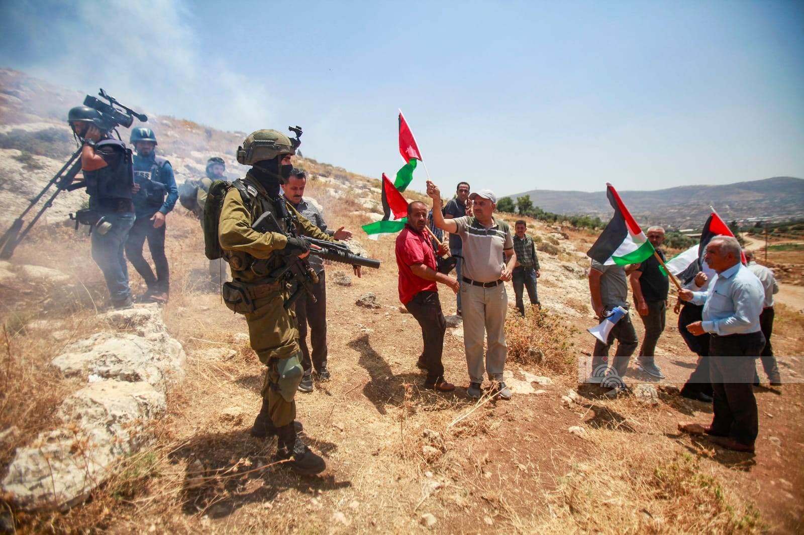 وأصيب طفل بقنبلة غاز في الظهر، وعدد من المواطنين بالاختناق، خلال قمع قوات الاحتلال مسيرة ضد الاستيطان في قرية بيت دجن، شرق نابلس.