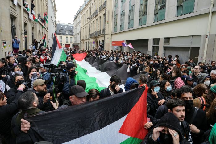اعتصم عدد من الطلبة داخل مبنى جامعة "سيانس بو" في العاصمة الفرنسية باريس، تنديدا بانتهاكات الاحتلال بحق شعبنا، مرددين هتافات داعمة لشعبنا الفلسطيني، ورفعوا العلم الفلسطيني على النوافذ وفوق مدخل المبنى، وعدد منهم وضعوا الكوفية ذات اللونين الأسود والأبيض التي أصبحت رمزا للتضامن مع غزة.