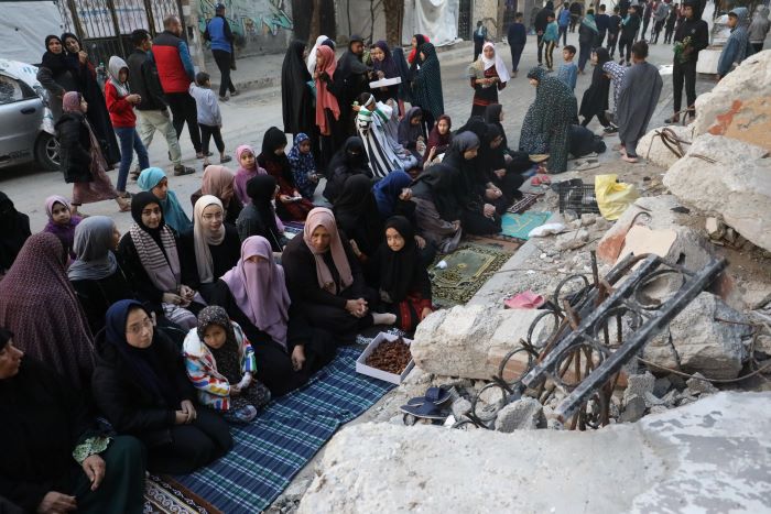 غزة 30-3-2025 وفا- أدى المواطنون في قطاع غزة، اليوم الأحد، صلاة عيد الفطر المبارك فوق أنقاض المساجد التي دمرها الاحتلال الإسرائيلي، وفي مدارس الإيواء التي نزحوا إليها، وفي الساحات العامة، بينما غابت مظاهر الفرح والاحتفال، في ظل حرب الإبادة المتواصلة منذ 7 أكتوبر/ تشرين الأول 2023.