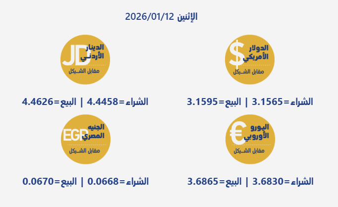 رام الله 12-1-2026 وفا- جاءت أسعار صرف العملات مقابل الشيقل الإسرائيلي، اليوم الإثنين، بحسب سلطة النقد الفلسطينية، على النحو التالي: