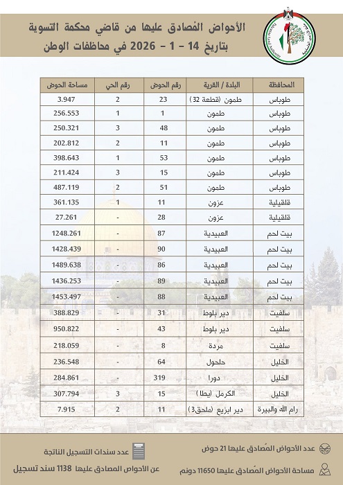 رام الله 19-1-2026 وفا– أعلنت سلطة الأراضي عن إنجاز جديد ضمن أعمال مشروع تسوية الأراضي، تمثل في المصادقة على 21 حوض تسوية من قبل قاضي التسوية، نتج عنها إصدار 1138 سند تسجيل بعد استكمال الإجراءات القانونية المعتمدة.