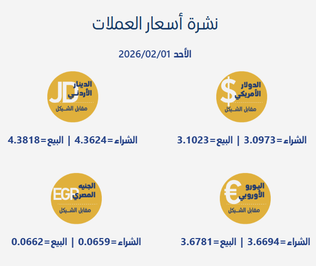 رام الله 1-2-2026 وفا- جاءت أسعار صرف العملات مقابل الشيقل الإسرائيلي، اليوم الاحد، بحسب سلطة النقد الفلسطينية، على النحو التالي: