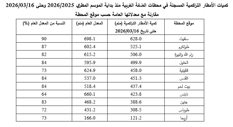 وعلى صعيد الضفة الغربية، أظهرت البيانات تحسناً ملحوظاً في الهطول المطري للموسم 2025/2026 مقارنة بالعام الماضي، حيث شملت الأمطار كافة المحافظات، لا سيما في شهري كانون الأول وكانون الثاني، وسجلت محطة سلفيت أعلى كمية أمطار بواقع 628 ملم، ما يمثل 90% من معدلها العام، بينما سجلت أريحا أدنى كمية بواقع 121.2 ملم ما يمثل 73% من معدلها العام.