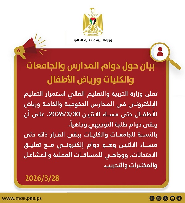 رام الله 28-3-2026 وفا- أعلنت وزارة التربية والتعليم العالي، اليوم السبت، استمرار التعليم الإلكتروني في المدارس الحكومية والخاصة ورياض الأطفال حتى مساء الإثنين المقبل 30 آذار 2026، على أن يبقى دوام طلبة الثانوية العامة "التوجيهي" وجاهيا.