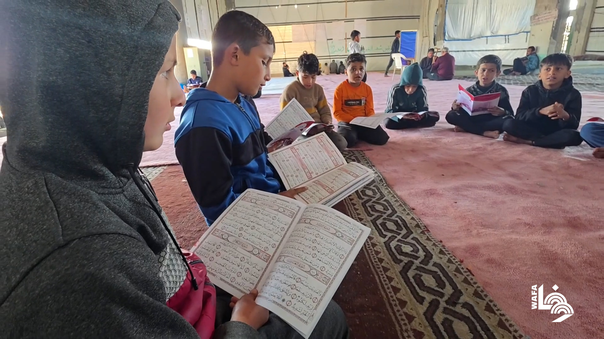 أطفال يقرأون القرآن في مسجد متضرر بخان يونس