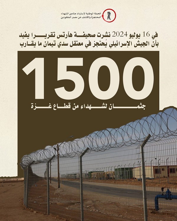 وذكرت الحملة، أن صحيفة "هآرتس" الإسرائيلية نشرت تقريرا في 16 تموز/يوليو الماضي، يفيد بأن جيش الاحتلال يحتجز في معتقل "سديه تيمان" ما يقارب 1500 جثمان لشهداء من قطاع غزة.