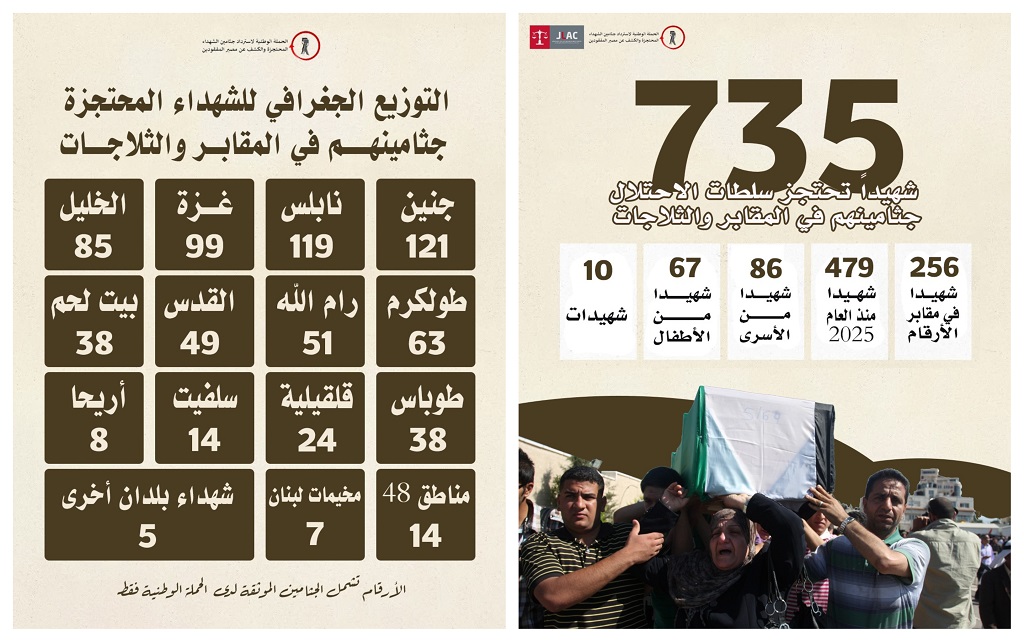 رام الله 10-10-2025 وفا- قالت الحملة الوطنية لاسترداد جثامين الشهداء المحتجزة والكشف عن مصير المفقودين، اليوم الجمعة، إن سلطات الاحتلال الإسرائيلي تحتجز جثامين 735 شهيدا في مقابر الأرقام والثلاجات.
