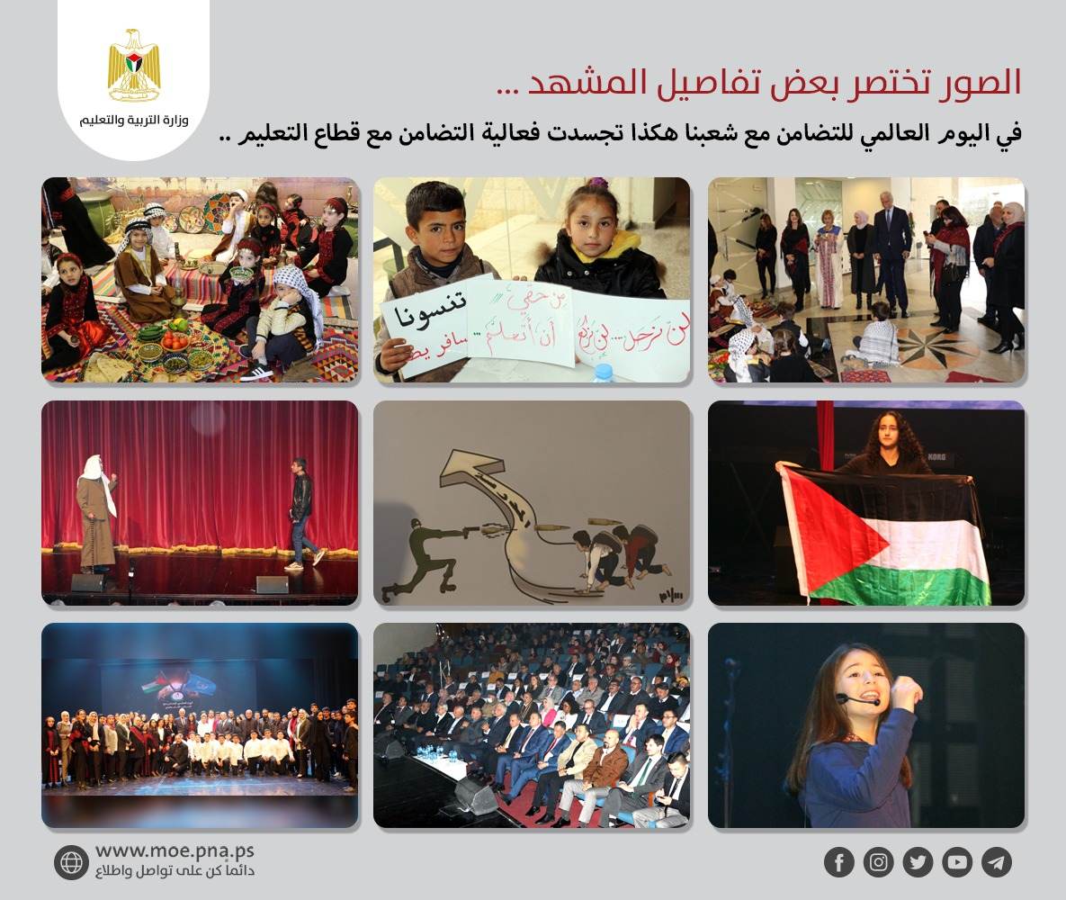 وتضمنت الفعالية تقديم لوحات، وعروض، ومعارض وطنية، وفنية، وتراثية، جسدت واقع التعليم في فلسطين، ونقلت رسالة عبرت عن صوت الطلبة، والأطفال، وذويهم والكادر التعليمي في تأكيد إصراره على الحياة والعيش الحر، ونيل تعليم حر، وآمن أسوة بدول العالم وشعوبه.