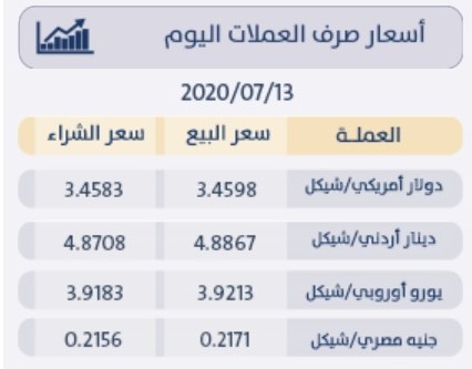 رام الله 13-7-2020 وفا- جاءت أسعار العملات مقابل الشيقل الإسرائيلي، اليوم الإثنين، حسب سلطة النقد، على النحو التالي:
