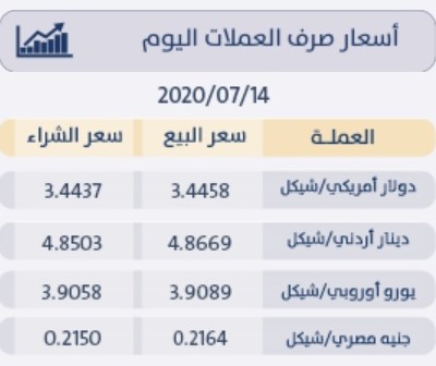 رام الله 14-7-2020 وفا- جاءت أسعار العملات مقابل الشيقل الإسرائيلي، اليوم الثلاثاء، حسب سلطة النقد، على النحو التالي: