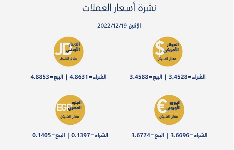 رام الله 19-12-2022 وفا- جاءت أسعار العملات مقابل الشيقل الإسرائيلي، اليوم الاثنين، حسب سلطة النقد، على النحو التالي: