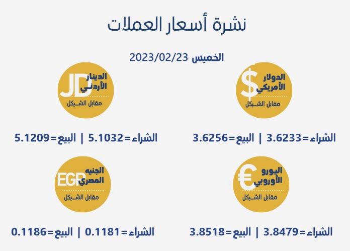 رام الله 23-2-2023 وفا- جاءت أسعار العملات مقابل الشيقل الإسرائيلي، اليوم الخميس، حسب سلطة النقد، على النحو التالي: