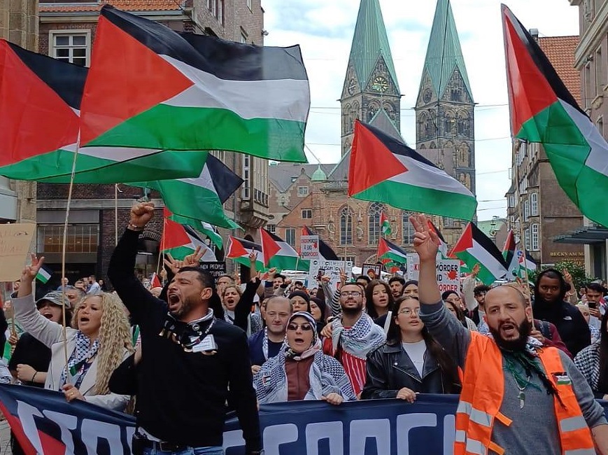 بريمن (ألمانيا) 9-6-2024 وفا- نظمت الجالية الفلسطينية في مدينة بريمن الألمانية وضواحيها، تظاهرة حاشدة تنديدا بمجزرة الاحتلال في مخيم النصيرات، وباستمرار العدوان على قطاع غزة، والضفة الغربية بما فيها القدس.