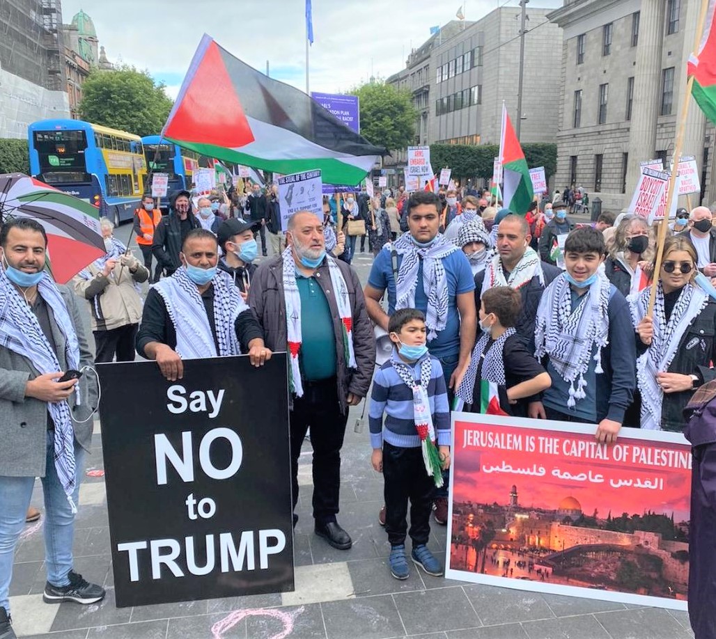 ورفع المشاركون في الوقفة العلم الفلسطيني، وشعارات تندد بنظام الأبارتايد الاسرائيلي في فلسطين، داعين الحكومة الايرلندية الجديدة إلى دعم الشعب الفلسطيني في مواجهة مخطط الضم، واتخاذ اجراءات ملموسة على الأرض، خاصة الضغط باتجاه استكمال العمل على قانون تجريم ومنع دخول بضائع المستوطنات بتاتا إلى السوق الايرلندية.