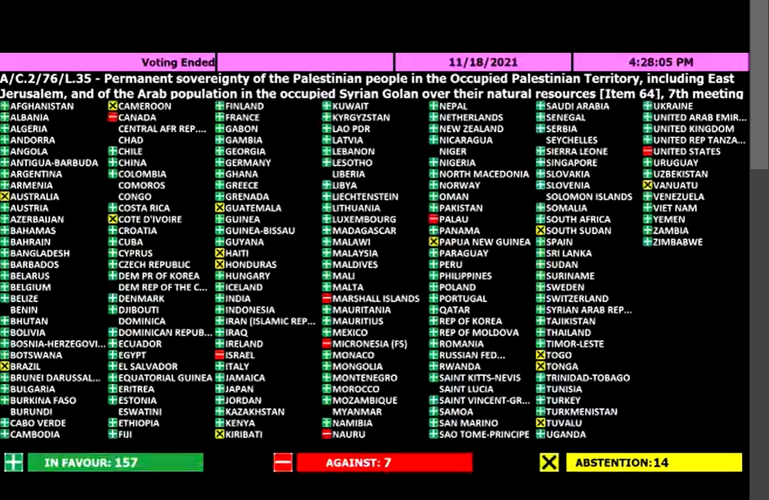 وصوت لصالح القرار 157 صوتا، فيما عارضته 7 دول (أمريكا، إسرائيل، كندا، ونايرو، ميكرونيزيا، جزر مارشال وبالاو)، وامتنعت 14 دولة عن التصويت.