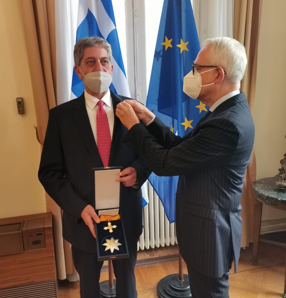 أثينا 17-12-2021 وفا- قلد وزير خارجية اليونان نيكولاوس دندياس سفير دولة فلسطين لدى اليونان مروان طوباسي وسام "فينيق الجمهورية من درجة القائد الكبير"، بقرار من رئيسة الجمهورية ووزير الخارجية.