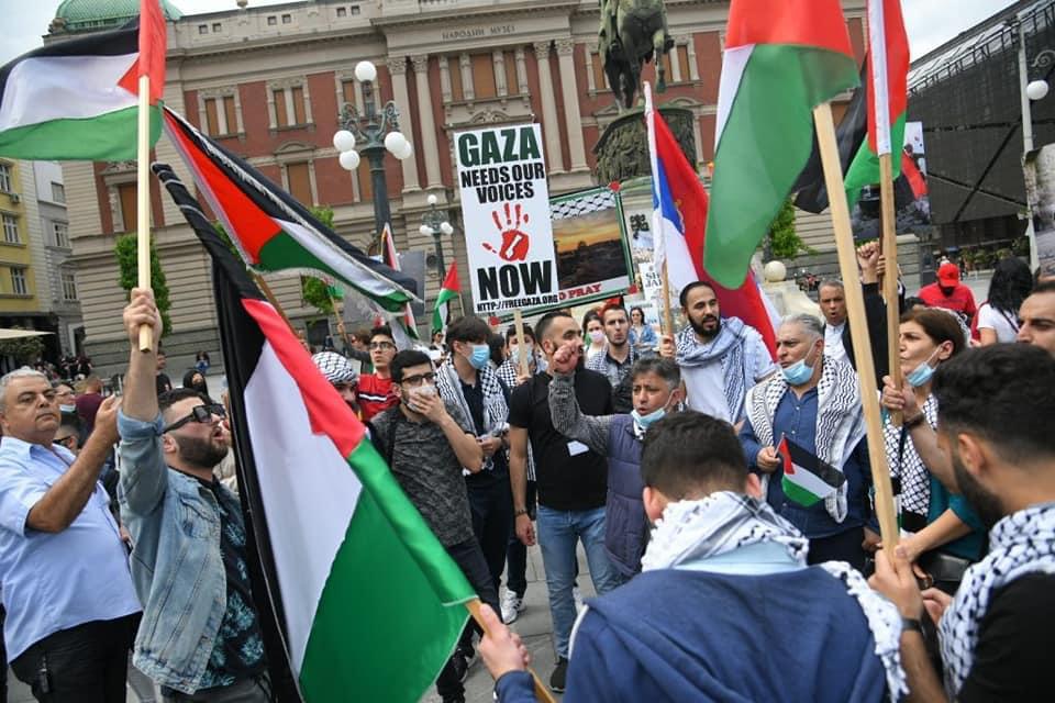 بلغراد 19-5-2021 وفا- نظمت الجالية الفلسطينية في صربيا مظاهرة وسط العاصمة بلغراد، داعمة لفلسطين ومنددة بالاعتداءات الإسرائيلية على ابناء شعبنا خاصة في غزة والقدس، ورفضا لمخططات التهجير العرقي والإحلال في حي الشيخ جراح.
