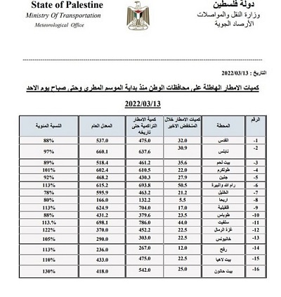 رام الله 13-3-2022 وفا- أعلنت دائرة الأرصاد الجوية، اليوم الأحد، عن كميات الأمطار الهاطلة على محافظات الوطن منذ بداية الموسم المطري وحتى صباح اليوم، كالتالي: