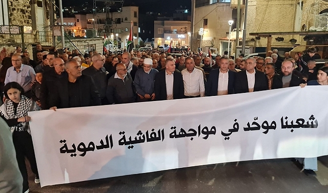 سخنين 28-2-2023 وفا- شارك الآلاف من أبناء شعبنا داخل أراضي عام 1948، مساء اليوم الثلاثاء، في تظاهرة قطرية بسخنين، تنديدا باعتداءات المستوطنين وقوات الاحتلال الإسرائيلي في الضفة الغربية، خاصة في حوارة، جنوب نابلس، والقرى المجاورة لها.