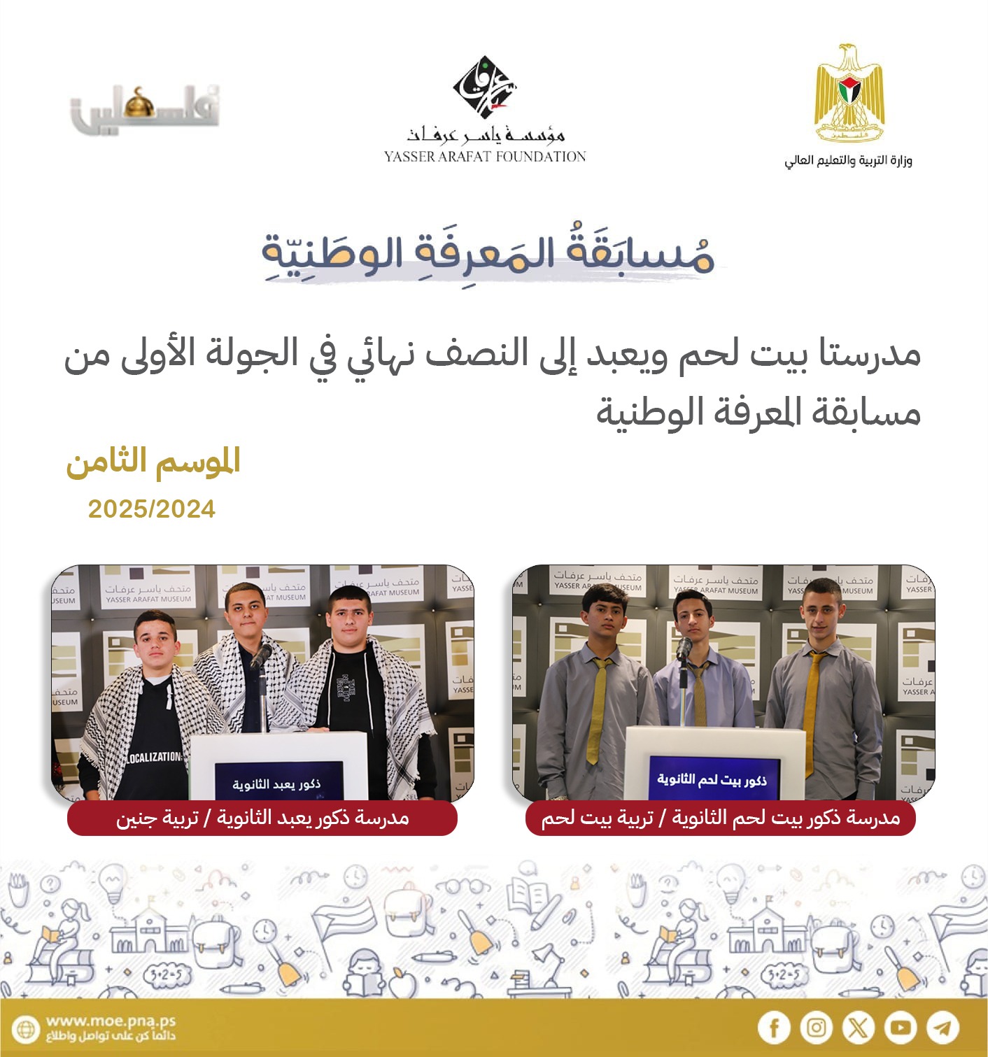 رام الله 12-4-2025 وفا- فازت مدرسة ذكور بيت لحم الثانوية من تربية بيت لحم بالمركز الأول في الحلقة الأولى بمسابقة المعرفة الوطنية من موسمها الثامن، اليوم السبت، التي عقدت في متحف ياسر عرفات بمدينة رام الله.