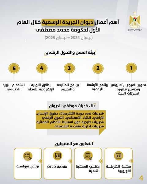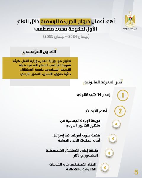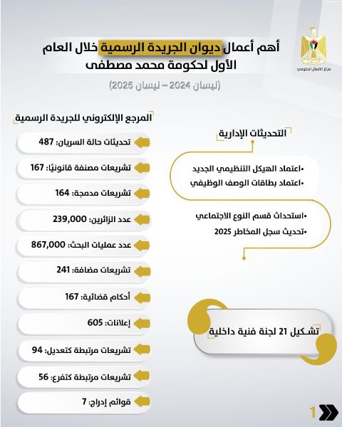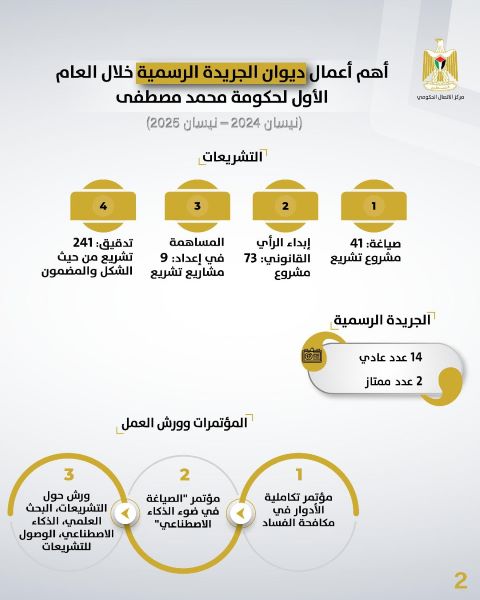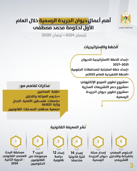 رام الله 23-7-2025 وفا- نشر مركز الاتصال الحكومي تقريرًا بأهم أعمال ديوان الجريدة الرسمية خلال العام الأول من تولي الحكومة مهامها، مسلطًا الضوء على دور الديوان في دعم المنظومة التشريعية وتعزيز التحول الرقمي والنشر القانوني.
