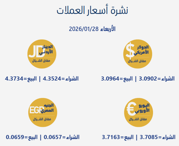 رام الله 28-1-2026 وفا- جاءت أسعار صرف العملات مقابل الشيقل الإسرائيلي، اليوم الأربعاء، بحسب سلطة النقد الفلسطينية، على النحو التالي:
