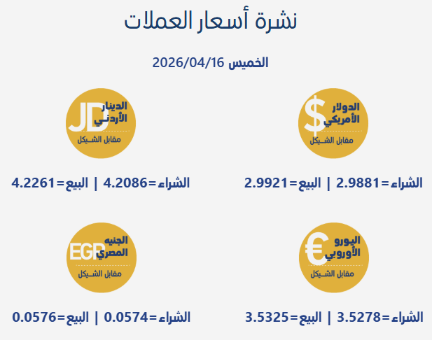 رام الله 16-4-2026 وفا- جاءت أسعار صرف العملات مقابل الشيقل الإسرائيلي، اليوم الخميس، بحسب سلطة النقد الفلسطينية، على النحو التالي: