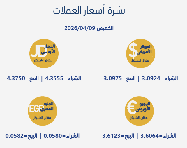رام الله 9-4-2026 وفا- جاءت أسعار صرف العملات مقابل الشيقل الإسرائيلي، اليوم الخميس، بحسب سلطة النقد الفلسطينية، على النحو التالي: