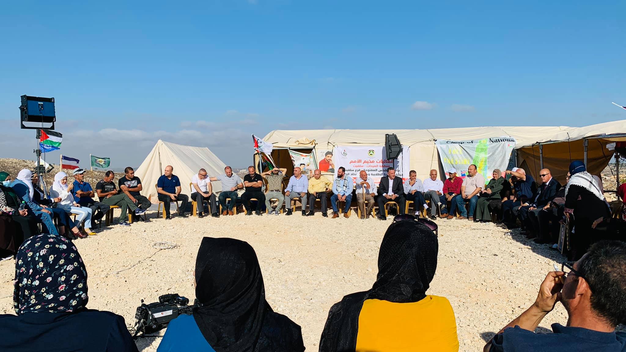 سلفيت 22-9-2021 وفا علا موقدي في خطوة هي الأولى من نوعها في تطوير المقاومة الشعبية وتسليط الضوء على الأراضي المهددة بالاستيطان، نظمت هيئة مقاومة الجدار والاستيطان، والفصائل الوطنية، وحركة "فتح" في مدينة سلفيت، "مخيم الأمم" على أراضي منطقة " المراحات" القريبة من منطقة الرأس المهددة بالاستيلاء من قبل المستوطنين.